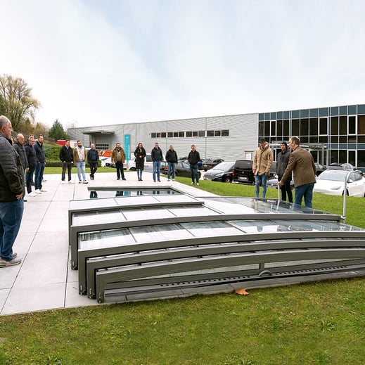 Erhalten Sie Einblicke in unsere Arbeitsweise, die Qualität unserer Fertigung und warum eine Poolüberdachung von Aura durch Design und Funktionalität überzeugt! Mit „Visit Aura“ laden wir Kunden unserer Vertriebspartner zu einem persönlichen Werksbesuch ein. Hier unterstützen wir Sie bei der Auswahl Ihres optimalen Modells – einschließlich Größe, Funktion und individuellen Anpassungen.