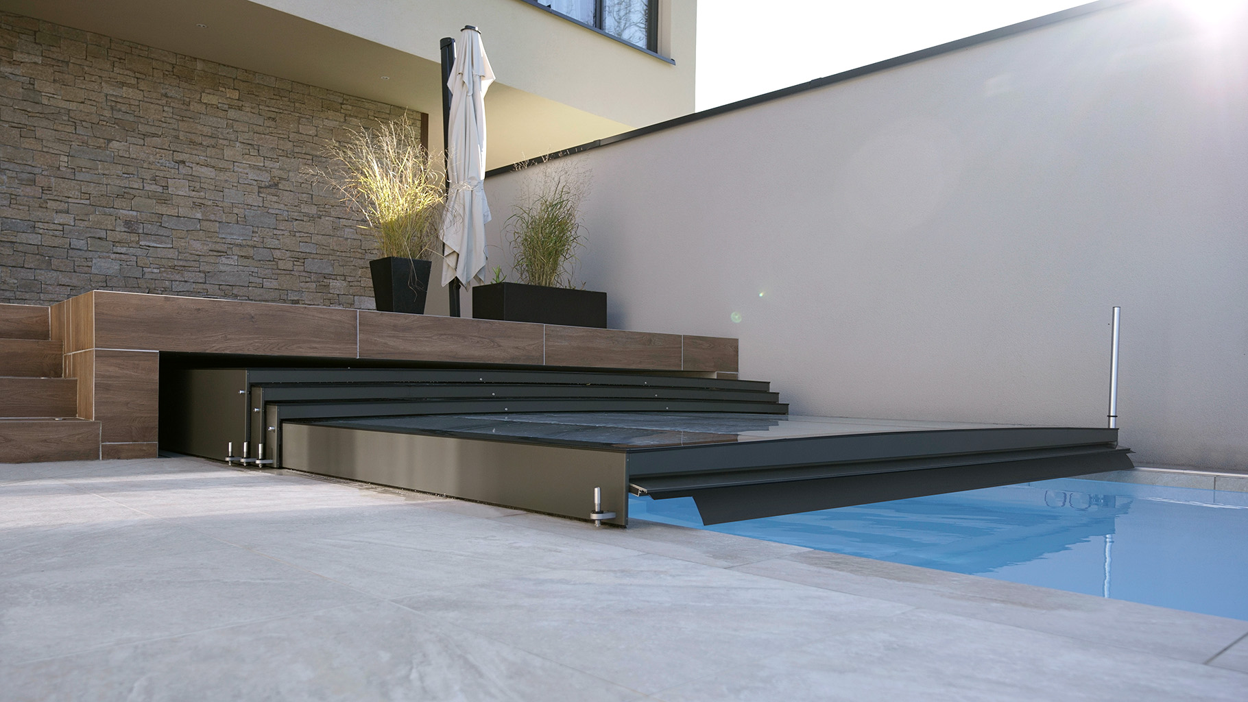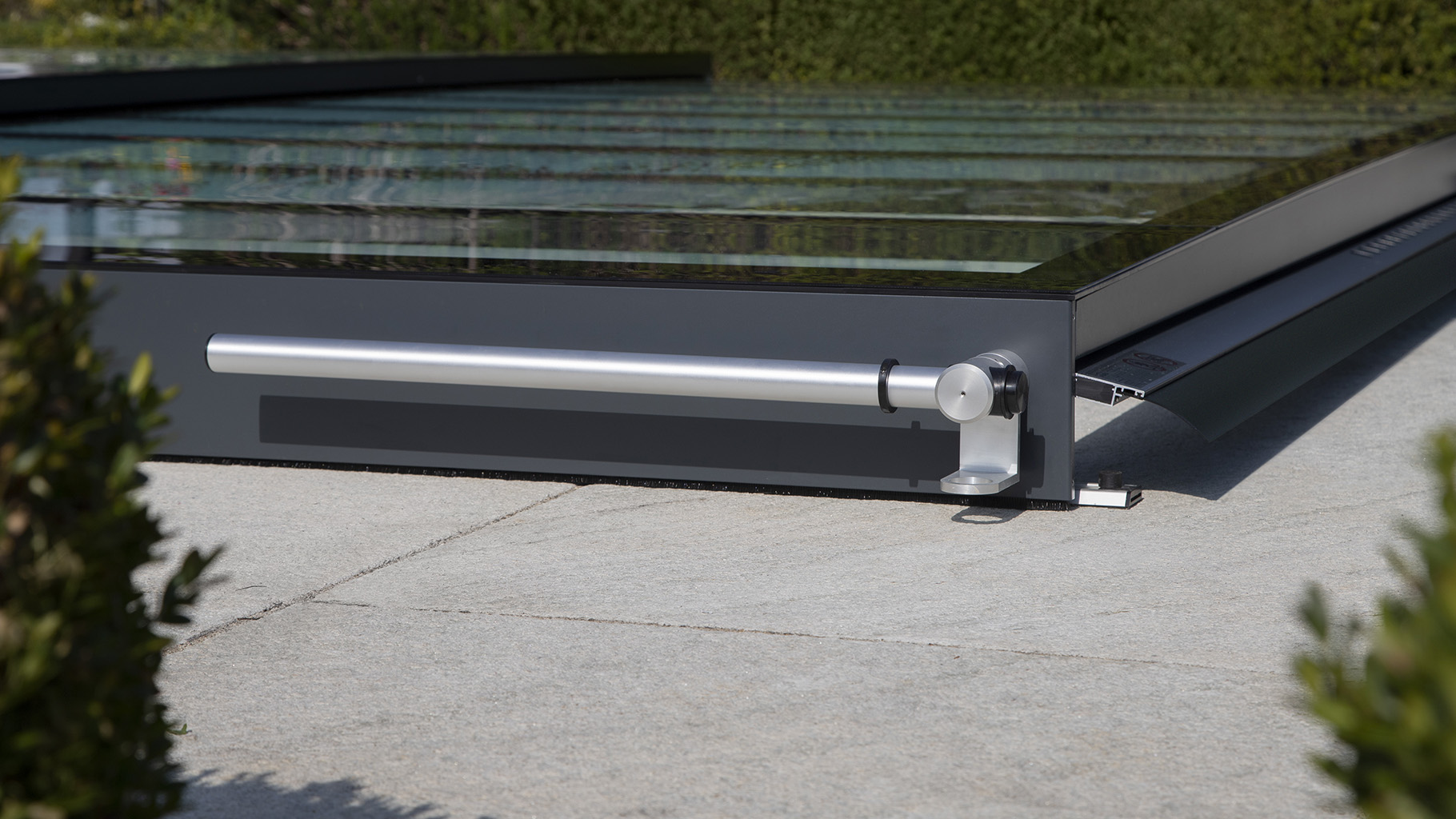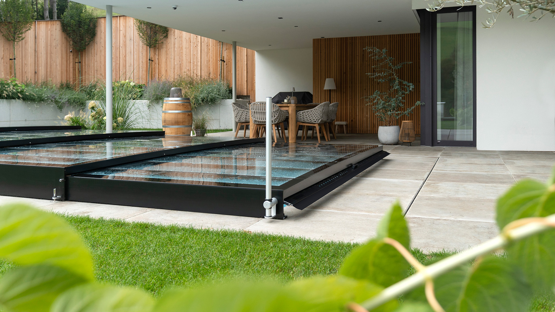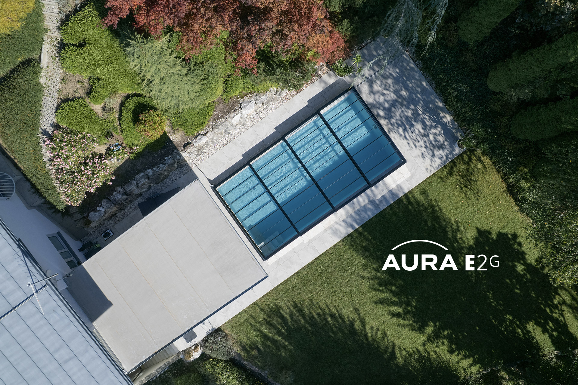 Die einzigartige Ganzglasoptik der E2G macht sie zu unserem Designerstück. Die E2G ist eine reine Poolabdeckung, jedoch wie bei Poolüberdachungen mit dem Vorteil des isolierenden Luftpolsters zwischen Wasseroberfläche und Verglasung. Zudem ist auch der Schmutzeintrag stark reduziert. Besonders raffiniert ist sie mit einem verborgenen Rahmenprofil und der über den Rahmen geführten Verglasung konstruiert. Durch die extrem niedrige Konstruktion ist die E2G nicht unterschwimmbar, dafür lässt sie sich aber auch besonders leicht auf- und zuschieben. Optional auch elektrisch unterstützt mit dem Swing-E!