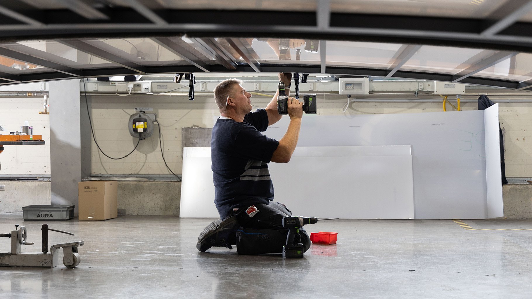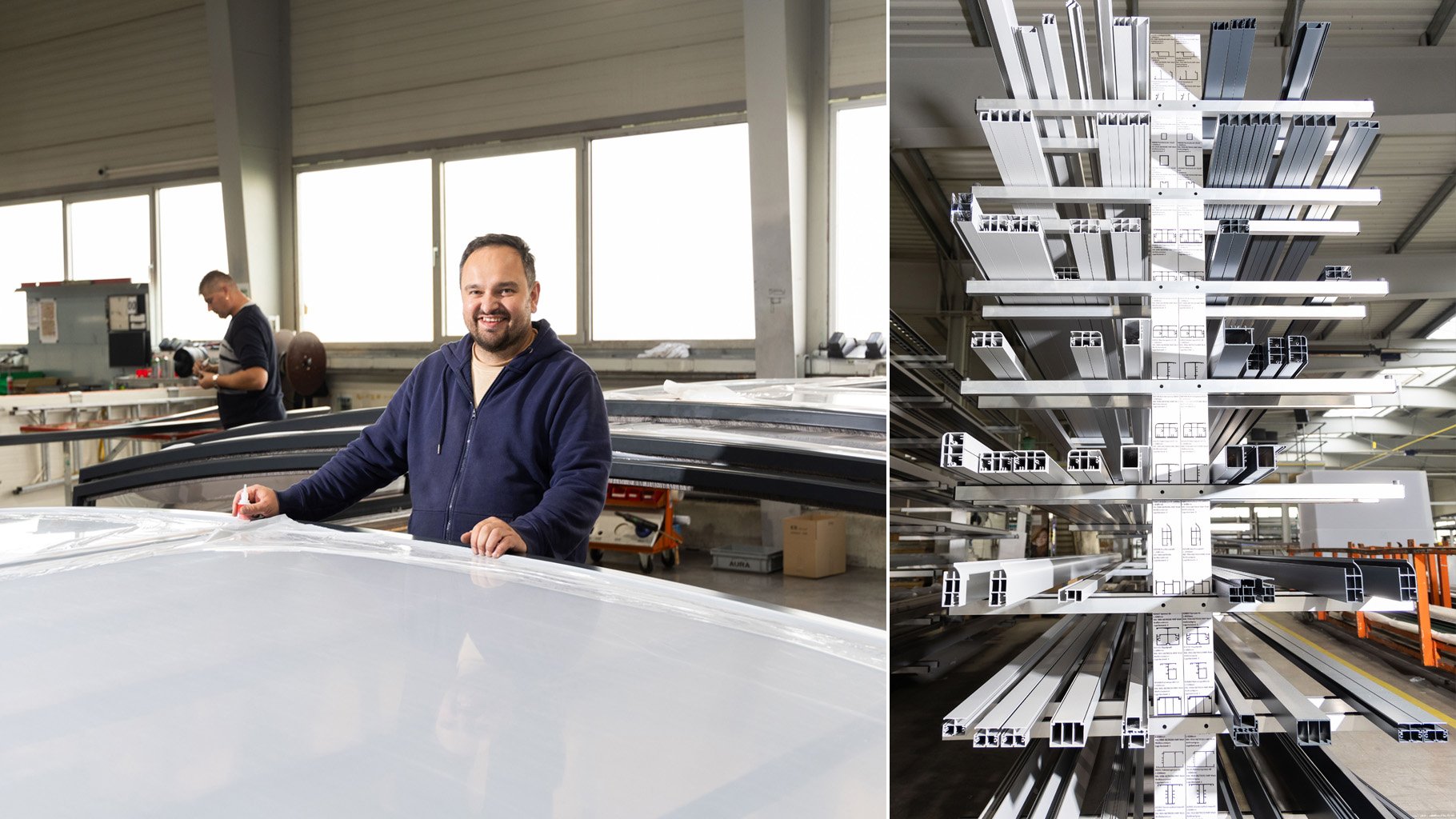 Unsere Mitarbeiter sind Facharbeiter aus dem Bereich Tischler und Metallbau. Alle Aura Überdachungen werden im Werk vormontiert und gründlich geprüft. Für eine einfache Montage am Pool. Ordnung muss sein. Unser übersichtliches Handlager für Aluminiumprofile.